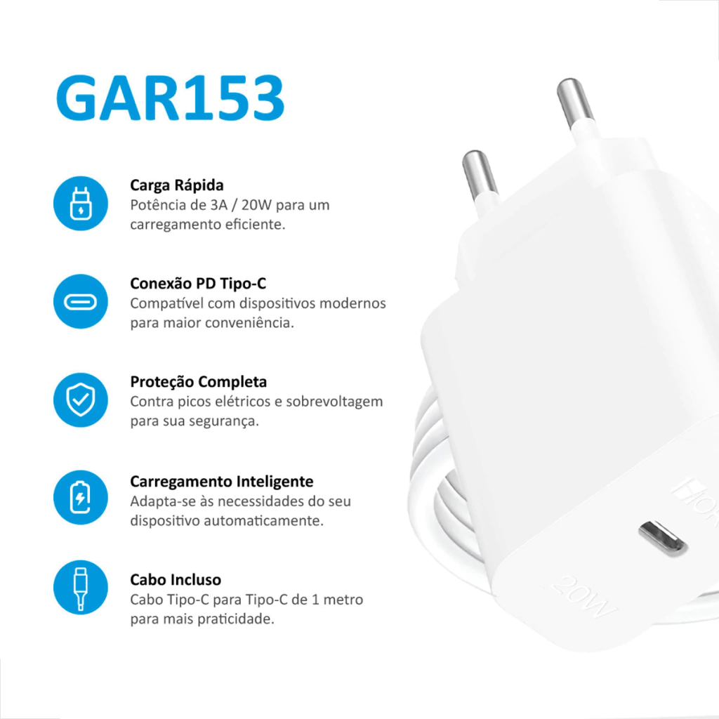 O Kit Carregador MAX PD 20W + Cabo Tipo-C para Tipo-C 3A oferece carregamento ultra-rápido (até 20W) via tecnologia Power Delivery (PD) para dispositivos compatíveis, prometendo cargas rápidas em cerca de 1 hora, com o cabo USB-C de 1 metro suportando 3A, sendo seguro (proteção contra sobrecarga) e ideal para smartphones modernos, com design compacto e homologado pela ANATEL.